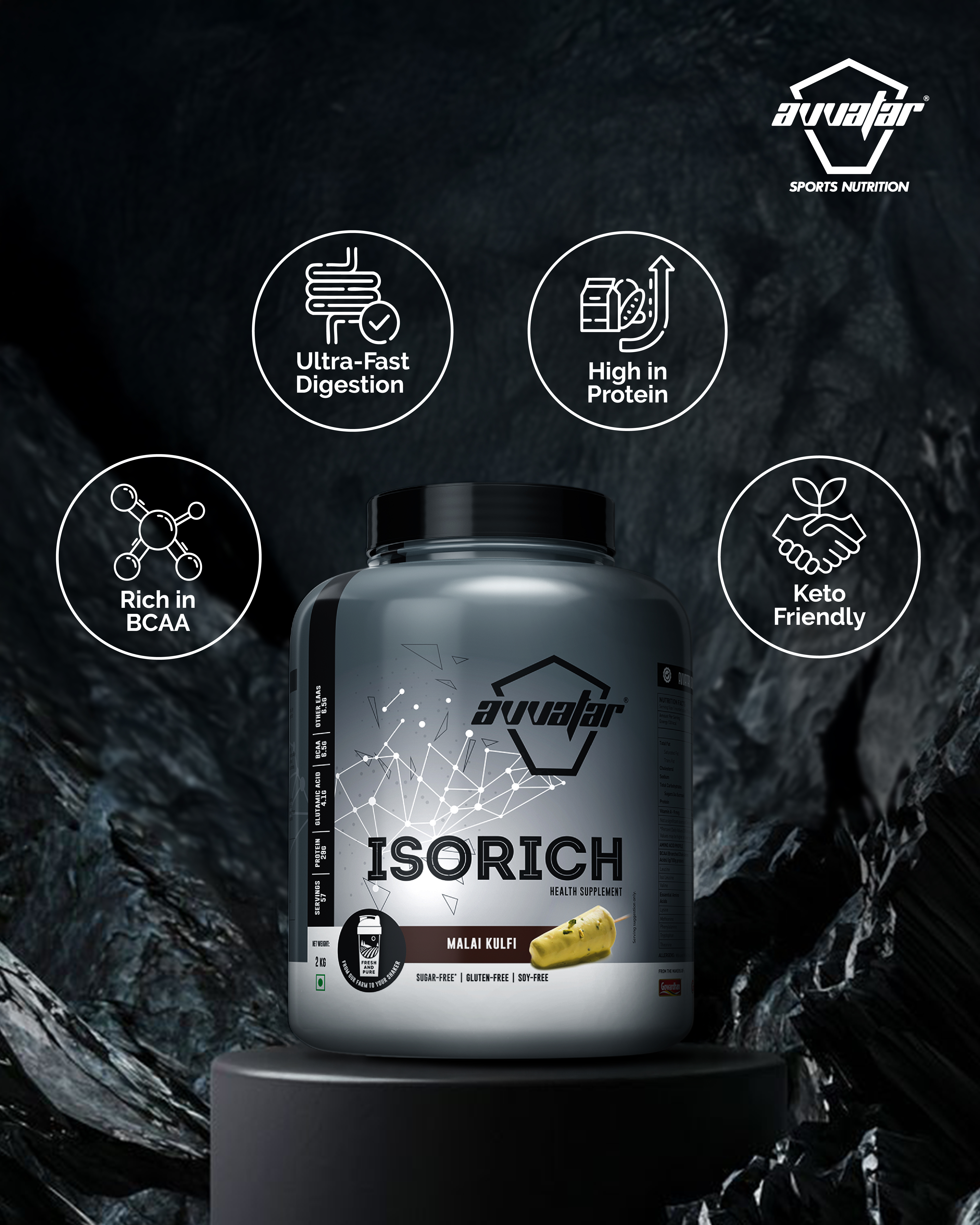 Avvatar Isorich Protein is packed with 29 GMS protein per scoop. The primary source is whey protein isolate which is loaded with health-boosting bioactive compounds along with natural phospholipids for quick recovery and sustained results!