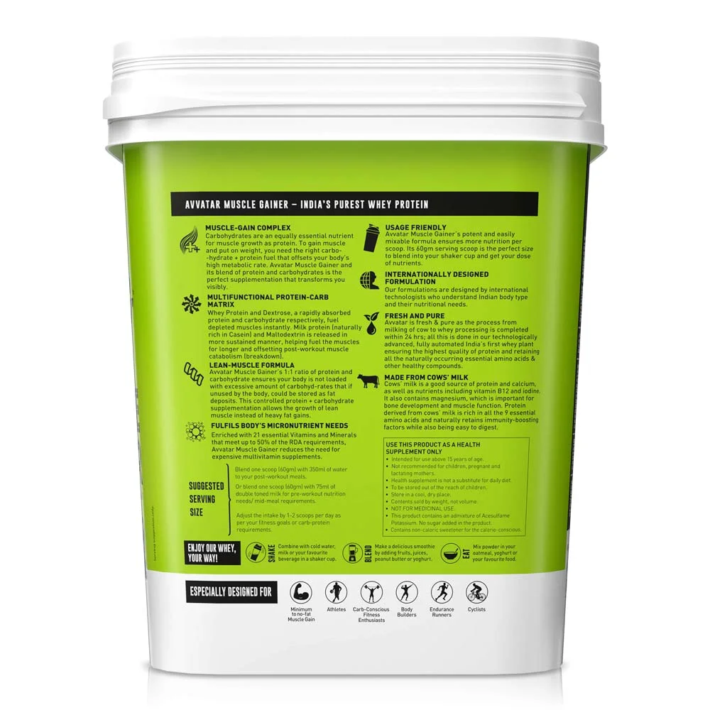 Unlock your true potential with Avvatar Muscle Gainer, a powerhouse packed with an impressive 44.5 grams of protein per 100 grams of rounded scoop.