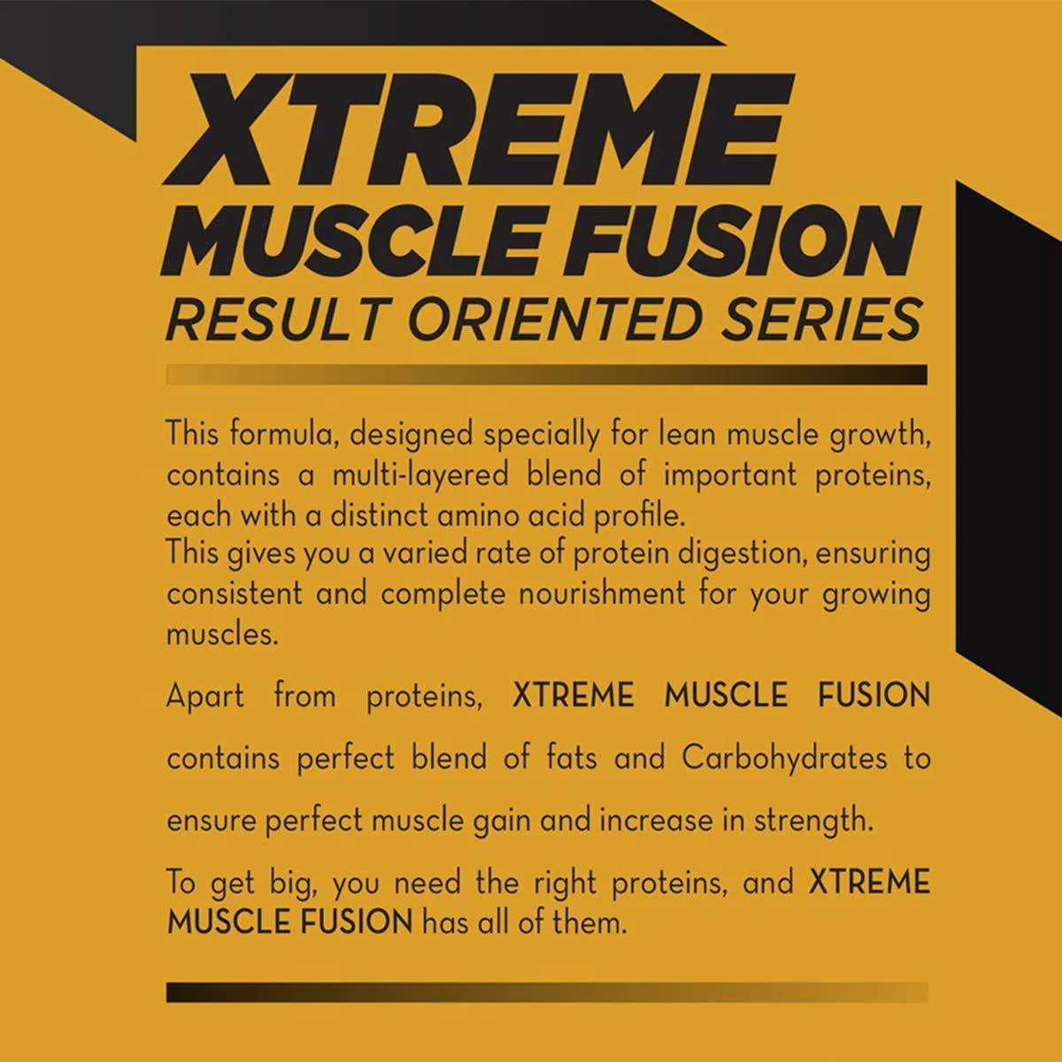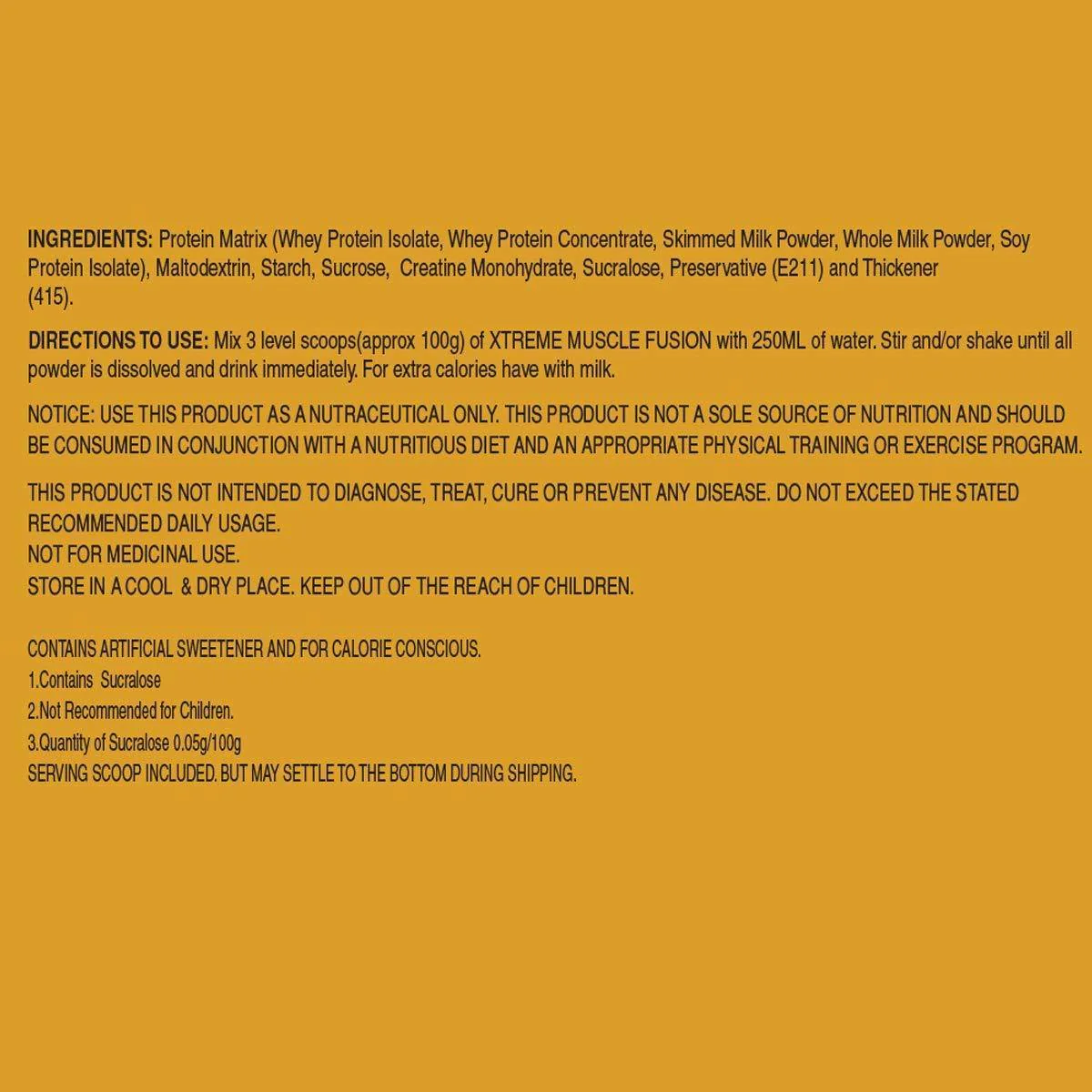 Mix 3 level scoops (approx. 100g) of XTREME MUSCLE FUSION with 250 ML of water. For added calories add XTREME MUSCLE FUSION with milk. Stir and/or shake until dispersed and immediately drink. [/directions] [ingredients]Ingredients: Soy Protein Isolate, Malt dextrin, Whole Milk Powder, Skimmed Milk Powder, Added flavours, Whey Protein Concentrate (80%), Starch, Sucrose, Whey Protein Isolate(90%), Creatine Monohydrate, Cocoa powder, Added Flavors (Nature Identical Flavoring Substances), Calcium Phosphate & Calcium Phosphate.[/ingredients] [info]Big Muscles Xtreme muscle fusion features a protein source with one of the highest biological values and is easy to digest, mix and absorb. It is a combination that ensures active muscles are fed for hours with the most complete blend of proteins available. It is enhanced with core ingredients clinically shown to build more muscle and strength than whey protein alone. It is a lean generating protein, our multi layered protein blend utilizes multiple individual proteins, each with varying digestive rates and distinct amino acid profiles. It does exactly what it is suppose too - it will support muscle recovery, help with protein synthesis and create a positive nitrogen balance in your body. It is a faster digesting protein source because it contains whey protein concentrate and complex carbohydrates as well as an amino acid matrix. This supplement contains very few filler ingredients, giving it a pretty good protein/amino acid percentage. It incorporates a perfect blend of soy protein isolate, malt dextrin, whole milk powder, skimmed milk powder, whey protein concentrate (80 percent), starch, sucrose, whey protein isolate (90 percent), creatine monohydrate, cocoa powder, added flavours (nature identical flavouring substances), calcium phosphate and calcium phosphate. Direction of use: mix 3 level scoops (approximately 100g) of xtreme muscle fusion with 250 ml of water. For added calories add xtreme muscle fusion with milk. Stir and/or shake until dispersed and immediately drink. Ingredients: soy protein isolate, malt dextrin, whole milk powder, skimmed milk powder, whey protein concentrate (80 percent), starch, sucrose, whey protein isolate(90 percent), creatine monohydrate, cocoa powder, added flavours (nature identical flavouring substances), calcium phosphate and calcium phosphate. Direction of use: mix 3 level scoops (approximately 100g) of xtreme muscle fusion with 250 ml of water. For added calories add xtreme muscle fusion with milk. Stir and/or shake until dispersed and immediately drink.[/info] [/custom tab]