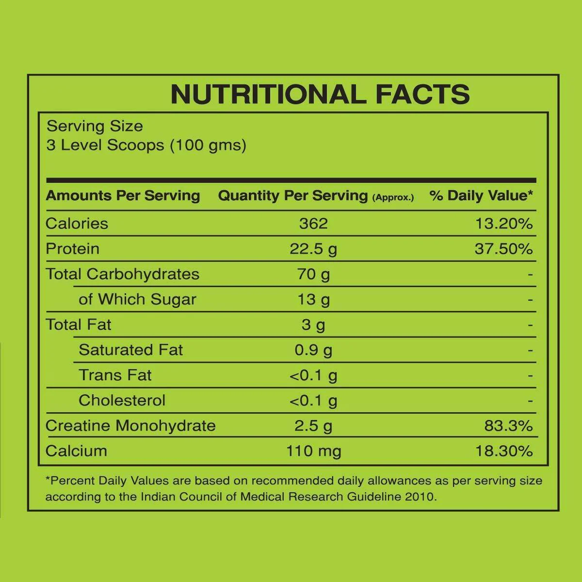 Protein Matrix (50.2%), (Skimmed Milk Powder, Soy Protein Isolate, Whey Protein Concentrate), Maltodextrin (28%), Starch, Creatine Monohydrate, Cocoa Powder, Sucralose, Preservative (E211), Thickener (415). |