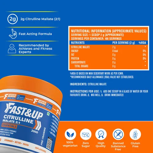 Fast&Up Citrulline Malate is designed with high quality, is banned substance free with no artificial colors or flavors, and contains an ideal ratio of 2:1 Citrulline and Malate. It is unflavored and helps promote muscle pump, delays fatigue, and provides power, strength, and endurance.