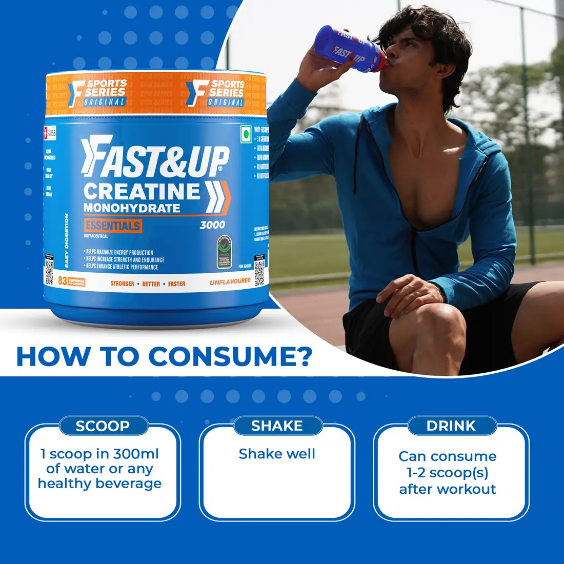 For superior performance, Add 1 scoop (3g) Creatine Monohydrate in 300ml water or your healthy beverage of choice, wait till it dissolves completely, and drinks immediately. Fast&Up Creatine Monohydrate can be mixed with other recipes or with other Fast&Up supplements as well