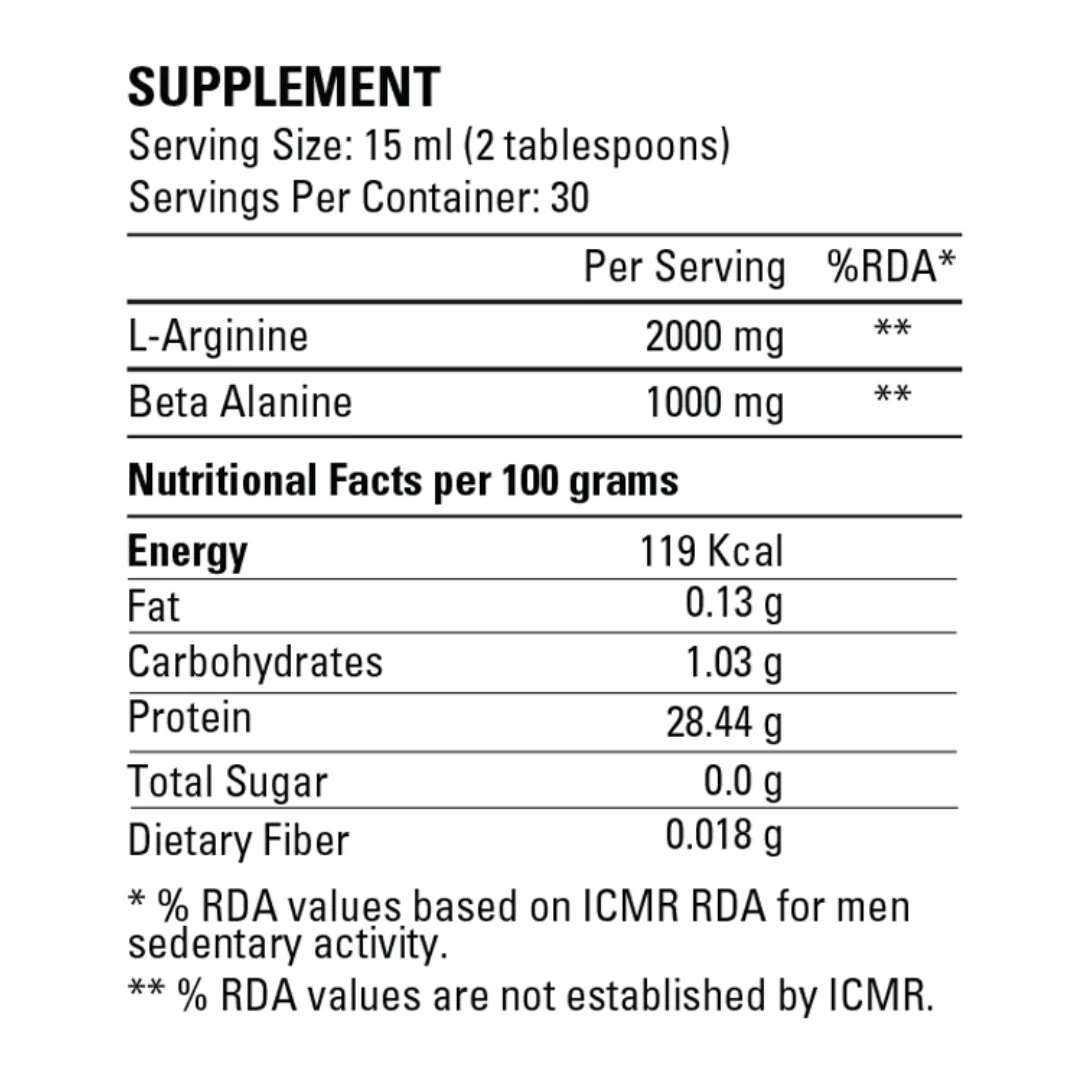 Experience explosive performance and take your workouts to the next level with B-Arginine. Our innovative formula combines the power of Beta-Alanine and L-Arginine to amplify nitric oxide production, providing you with unmatched stamina and muscular power. With purified water as the base, B-Arginine delivers a potent combination of ingredients to support your athletic performance. Choose from the refreshing flavours of Musk Melon, Green Apple, and Raw Mango to enhance your workout experience.