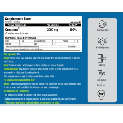 Elevate your performance to new heights with Creapure Creatine. Made with premium-quality Creapure Creatine Monohydrate from Germany, this powerful supplement provides the fuel you need for unparalleled strength and endurance. Unflavored for versatility, it can be easily mixed with water or juice. Consult with a dietician or licensed nutritionist for personalized recommendations. Fuel your fitness journey and unleash your full potential with Creapure Creatine.