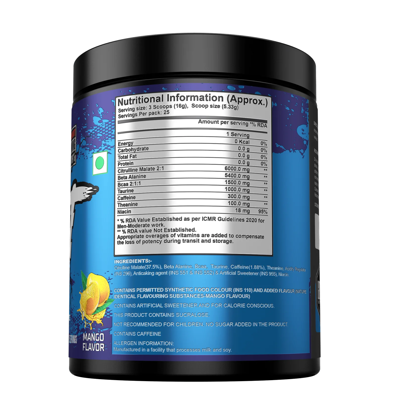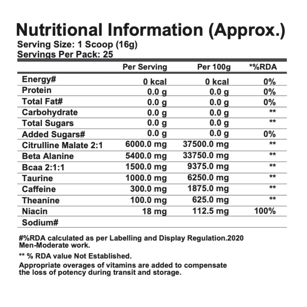 Ingredients:Citrulline Malate: Enhance blood flow, boost nitric oxide production, and reduce muscle fatigue during intense exercise.Beta Alanine: Improve endurance and delay muscle fatigue, allowing for longer and more intense workouts.BCAA: Provide essential amino acids to support muscle recovery and promote muscle growth.Taurine: Boost energy levels and enhance mental focus for optimal workout performance.Caffeine: Deliver a powerful energy surge to keep you energized and motivated throughout your training session.Theanine: Promote a state of calm focus, preventing jitters or crashes associated with caffeine consumption.Niacin: Support healthy energy metabolism and aid in the synthesis of macronutrients.