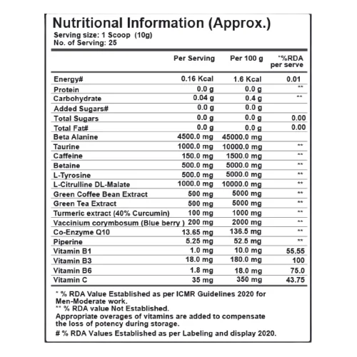 Ingredients:Beta Alanine: Enhance endurance and delay muscle fatigue for prolonged and intense workouts.L-Citrulline DL-Malate: Boost nitric oxide production, improve blood flow, and reduce muscle fatigue during exercise.L-Taurine: Increase energy levels and promote mental focus for optimal workout performance.Betaine Anhydrous: Support cellular hydration and enhance muscle strength and power.L-Tyrosine: Improve cognitive function and mental clarity for focused training sessions.Green Coffee Bean Extract: Provide natural caffeine for sustained energy and heightened alertness.Green Tea Extract: Deliver antioxidants and support metabolism for enhanced fat burning.Natural Caffeine: Stimulate energy production and enhance endurance during workouts.Vaccinium Corymbosum Extract: Contribute to overall well-being and recovery.Turmeric Extract: Provide anti-inflammatory properties to support joint health and recovery.Co-Enzyme Q10: Support energy production and enhance exercise capacity.Ascorbic Acid: Boost the immune system and support overall health.Niacinamide: Aid in energy metabolism and promote nervous system function.Piperine: Enhance nutrient absorption and bioavailability.Pyridoxine Hydrochloride: Support protein metabolism and overall energy production.Thiamine Hydrochloride: Aid in carbohydrate metabolism and energy production.