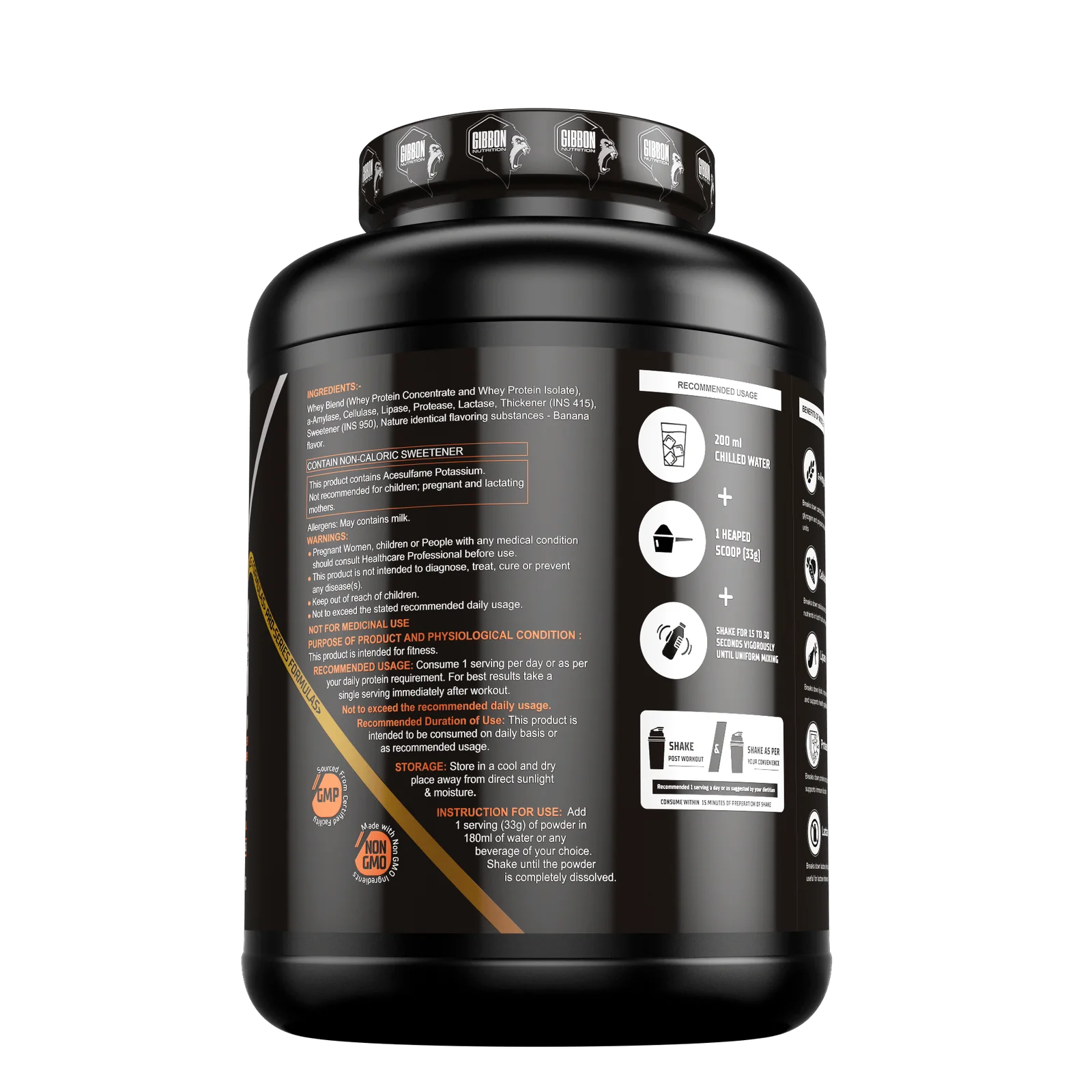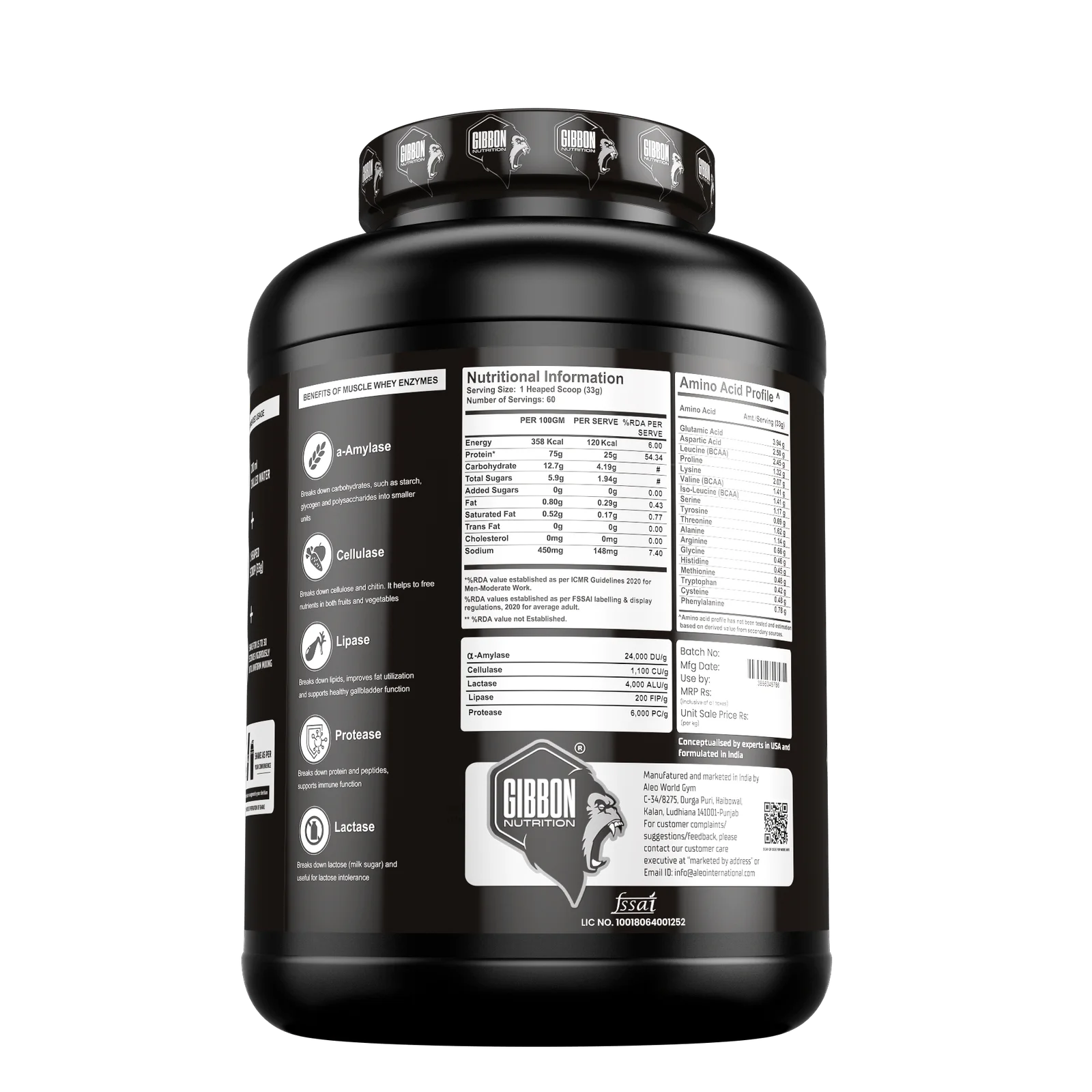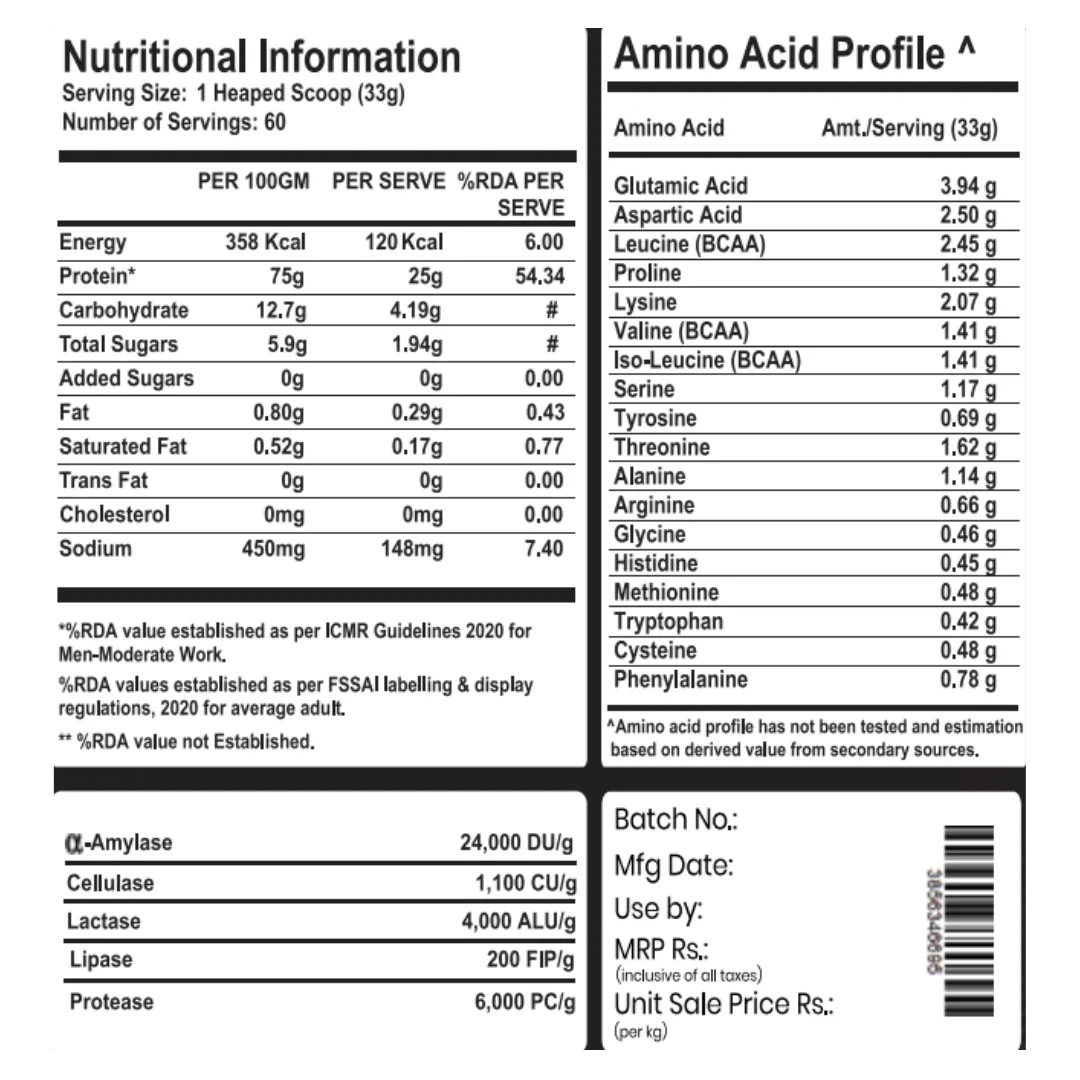 Ingredients:Whey Blend (Whey Protein Concentrate & Whey Protein Isolate): A potent combination of high-quality proteins to promote muscle growth, recovery, and strength.a-Amylase, Cellulase, Lipase, Protease, Lactase: Essential digestive enzymes that aid in the breakdown and absorption of proteins for optimal utilization