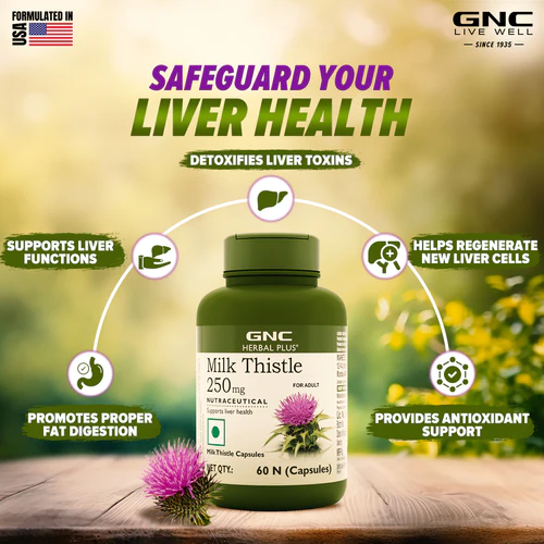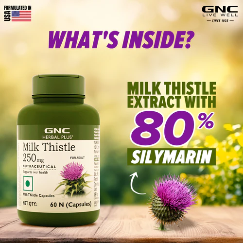 GNC Milk Thistle is a powerful herbal supplement designed to detoxify, protect, and support liver health. Each capsule delivers high-quality milk thistle extract rich in antioxidants to help eliminate toxins, promote better digestion, and maintain optimal liver function.