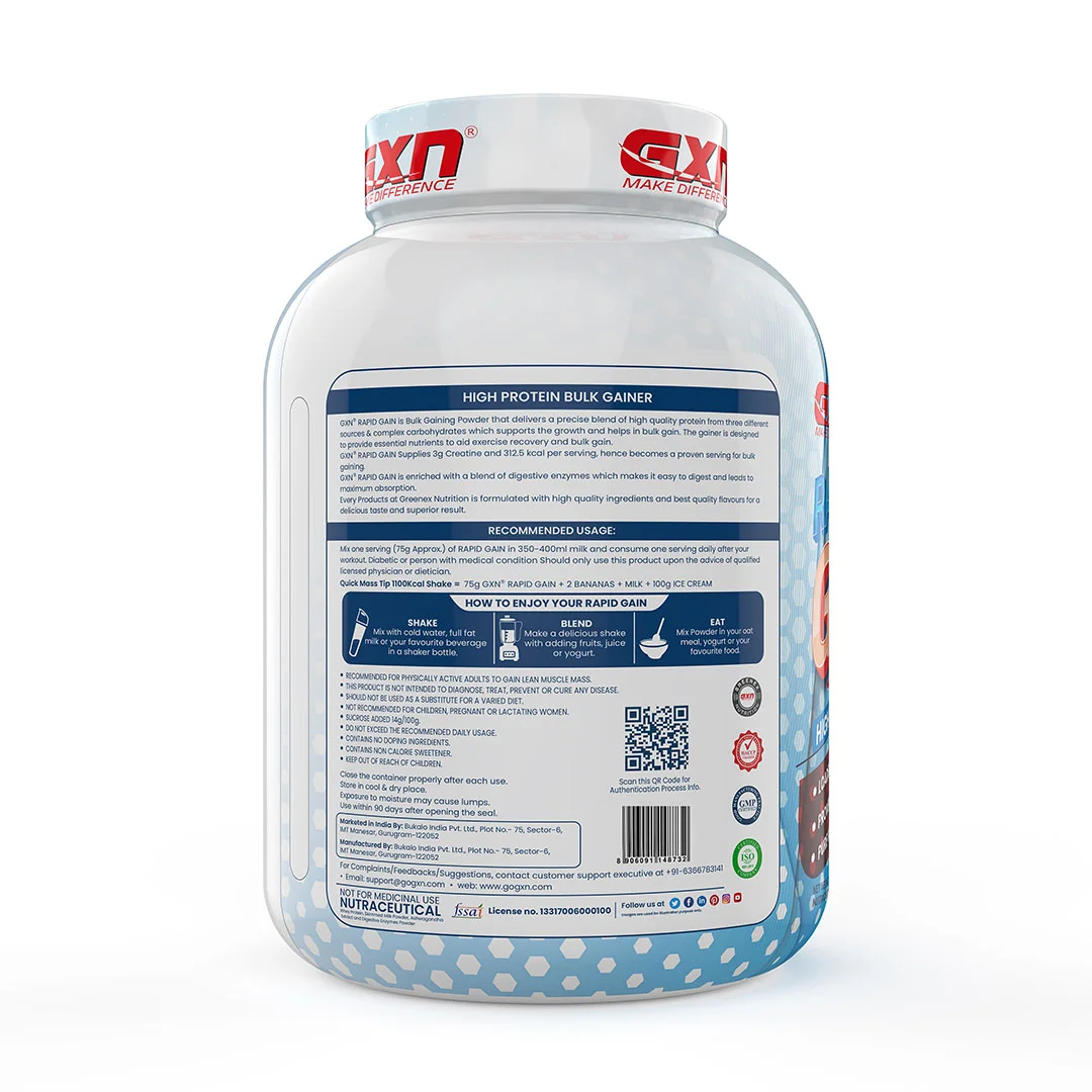 Rapid Gain is the new and best mass gainer supplement product of Greenex Nutrition (GXN). It contains 23g protein, 4g creatine, 2g dietary fibers in each 100g serving. Everyone dreams of building up an attractive body having a proper shape and wants to build up muscles hence appearance matters a lot. Being underweight also invites various diseases because of a weak immune system so it has to be managed to sustain a healthy life. Use of weight gain supplements is therefore, a necessity for lean people. These supplements can be highly beneficial for fast weight gain.