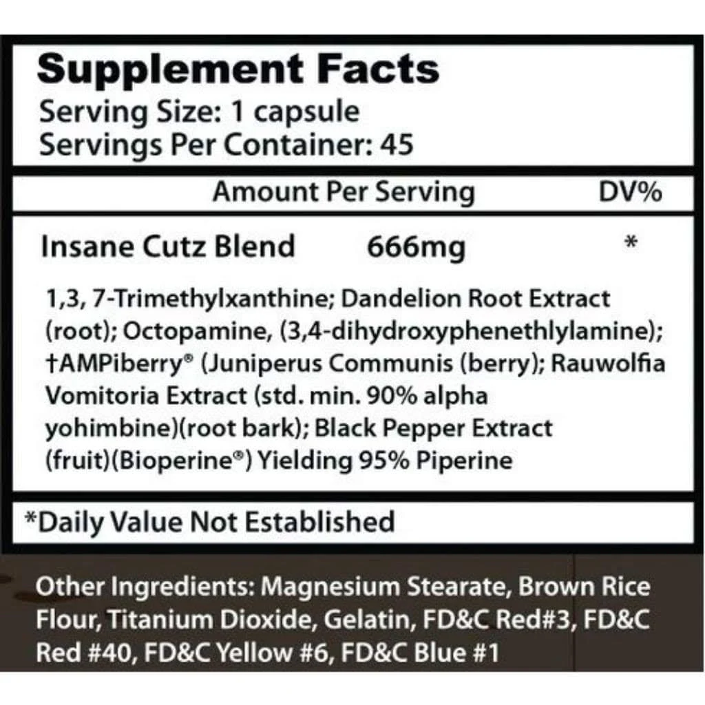 - BURN BODY FAT. Insane Cutz is a high stimulant thermogenic fat burner formulated to burn body fat while increasing your energy levels at the same time. Worried about preserving those muscle gains during the cutting phase? Don’t fret, Insane Cutz is formulated to only attack fat cells. Unlike every other run of the mill fat burner on the market, Insane Cutz is so strong you only need to take ONE serving daily.