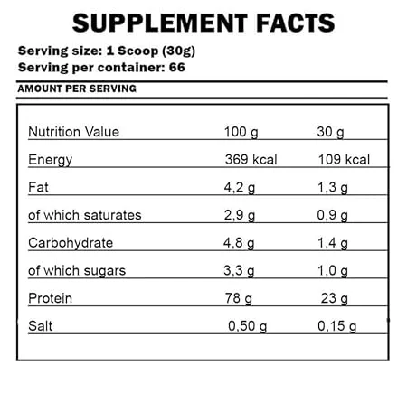 Every 30 g portion delivers 23,5 g of proteins, which contribute to the growth and maintenance of muscle mass while strengthening bones* – this makes it one of the most important nutrients, in particular for everyone doing long-term strength and/or endurance training. Additionally, every portion delivers 5 g of BCAA and 4 g of L-glutamine, which are highly valued and desired amino acids in the diet of hard training athletes.