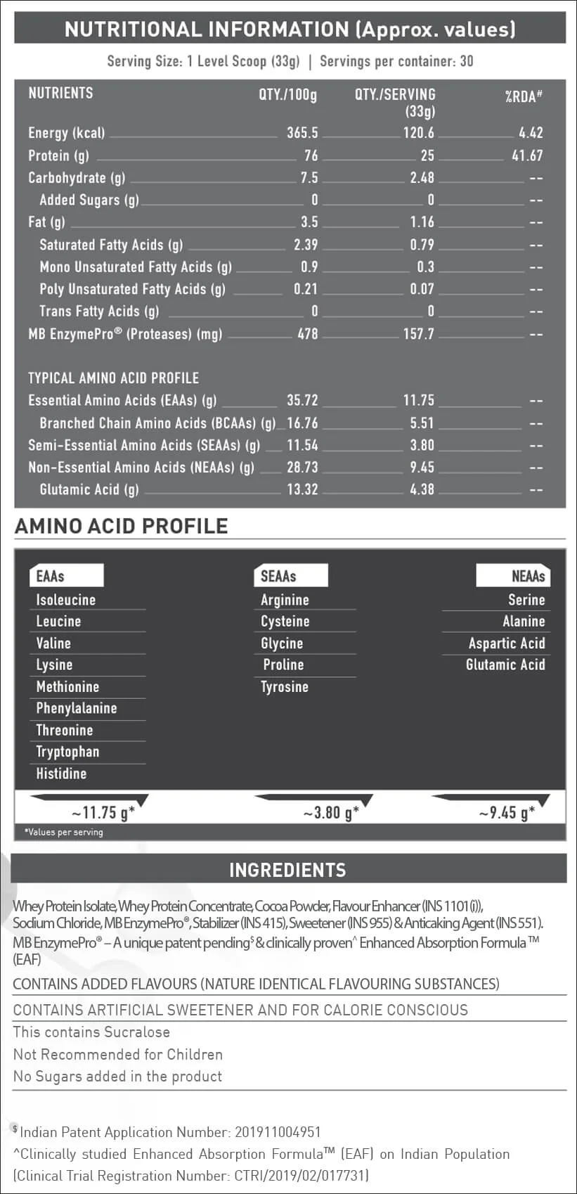 Protein’s bioavailability for the body ensures higher muscle gains or better post-workout recovery. MB’s International & Indian patents-published Enhanced Absorption Formula (EAF®) - also known as MB EnzymePro® - ensures 50% higher protein absorption and 60% higher BCAA absorption. This is a result of the higher bioavailability of protein enabled only by the Biozyme formulation!