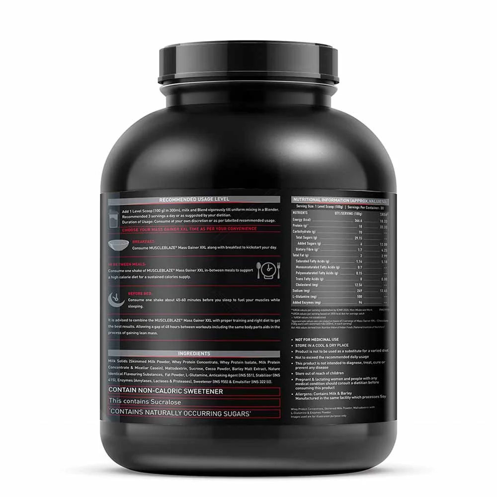 - For best results, combine 3 servings of MuscleBlaze Mass Gainer XXL per day with proper training and a healthy diet