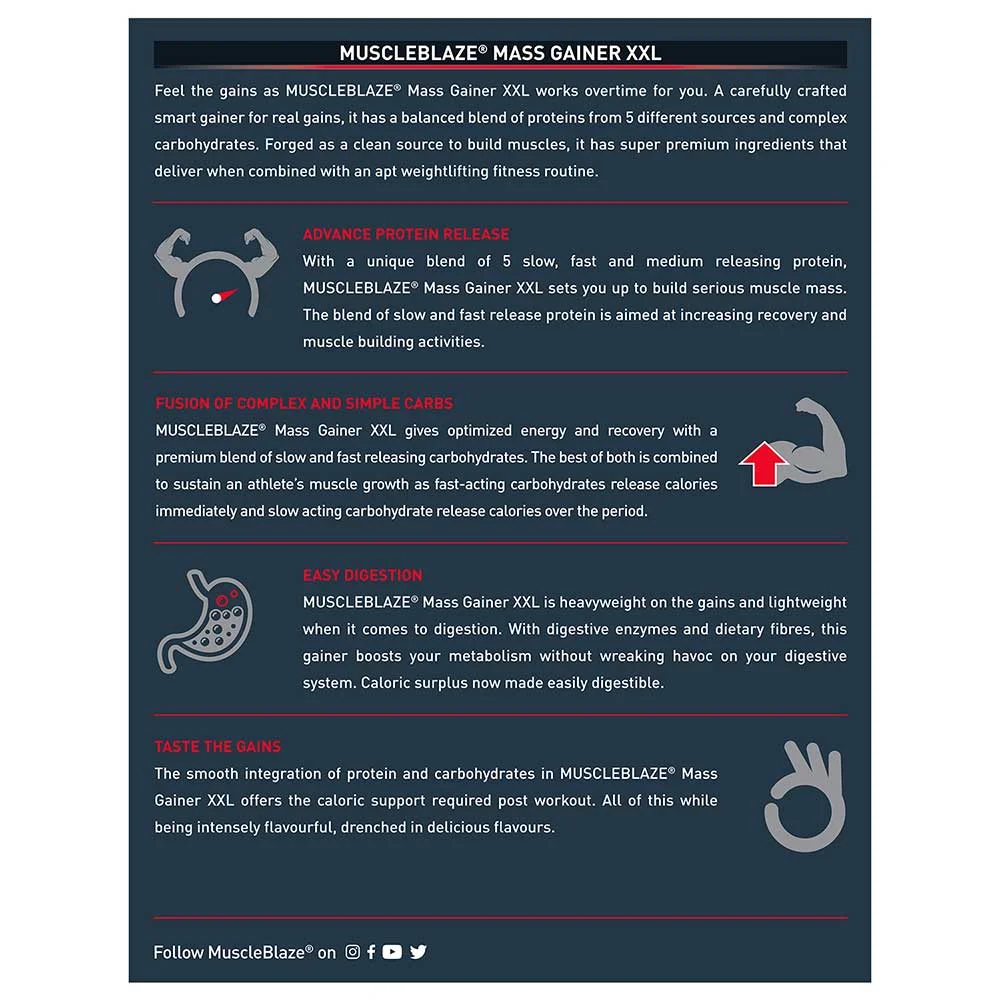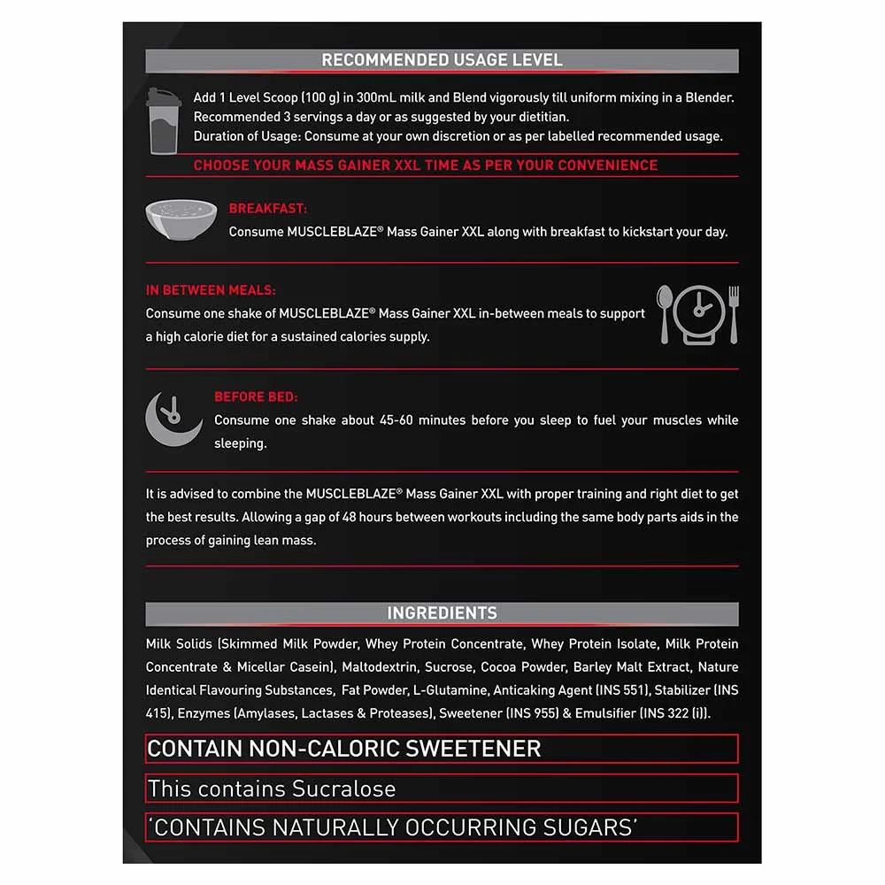 - Consuming one serving of MuscleBlaze Mass Gainer XXL about 45-60 minutes before bedtime fuels muscle strength during sleep.