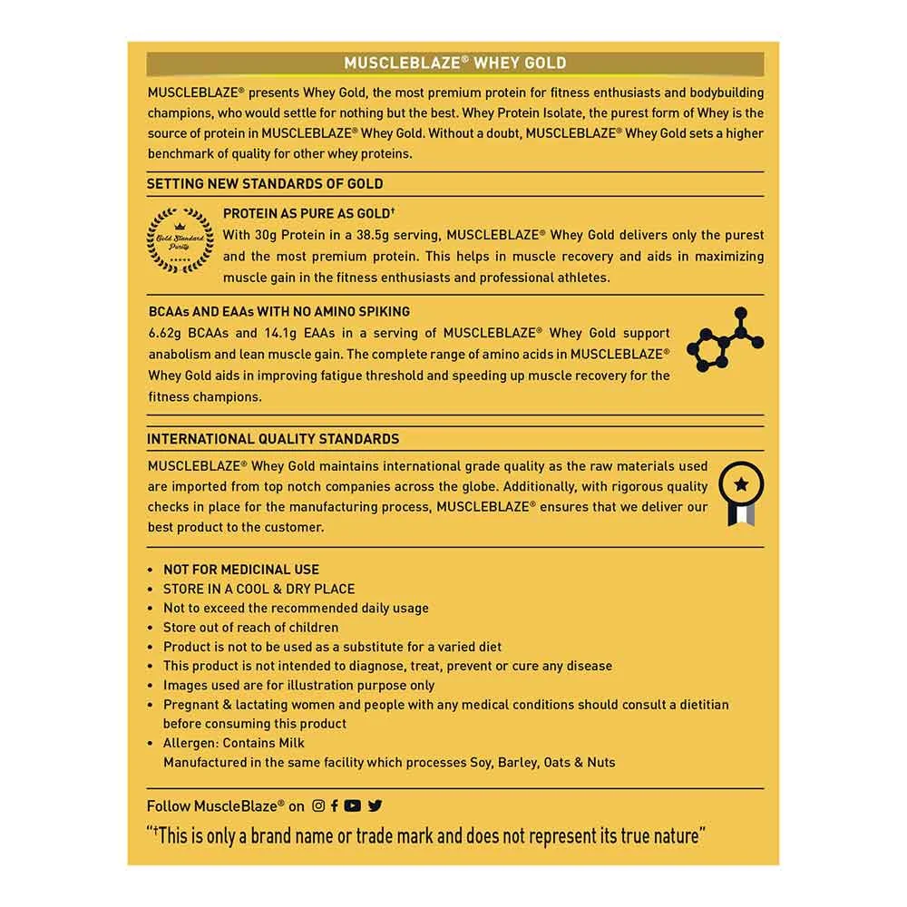 • 3 MuscleBlaze Whey Gold provides the body with vital amino acids including Leucine, Isoleucine, and Valine which elevate muscle synthesis and muscle recovery