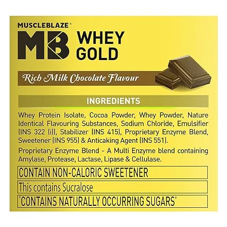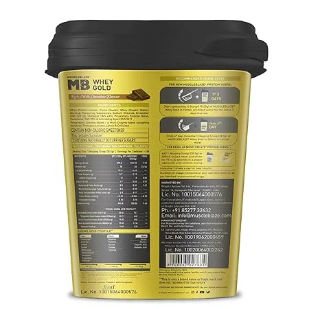 - Helps build lean muscles: MuscleBlaze Whey Gold protein does not contain any trans fat or harmful sweeteners. This product only uses artificial sweeteners permitted by the FSSAI to ensure that it is safe for you to use. With this, you can work towards a leaner and more chiseled physique as you do not have to worry about loading up on unwanted calories.