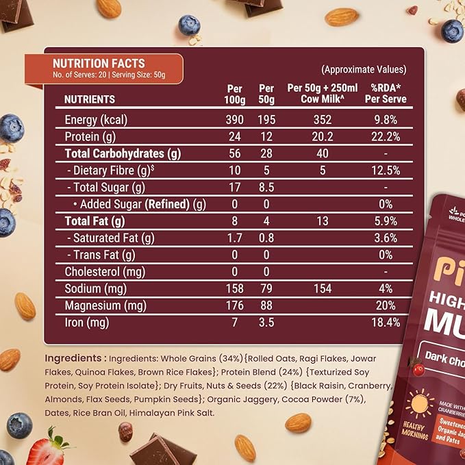 - PROTEIN POWERHOUSE: Pintola High Protein Muesli delivers an impressive 24g of high-quality protein per serving, making it an ideal choice for fitness enthusiasts, athletes, and anyone looking to increase their protein intake. This protein boost helps in muscle repair and growth, keeping you energized throughout the day.