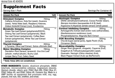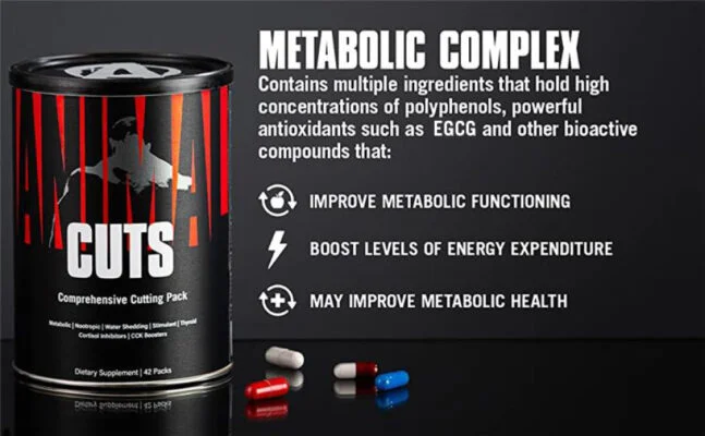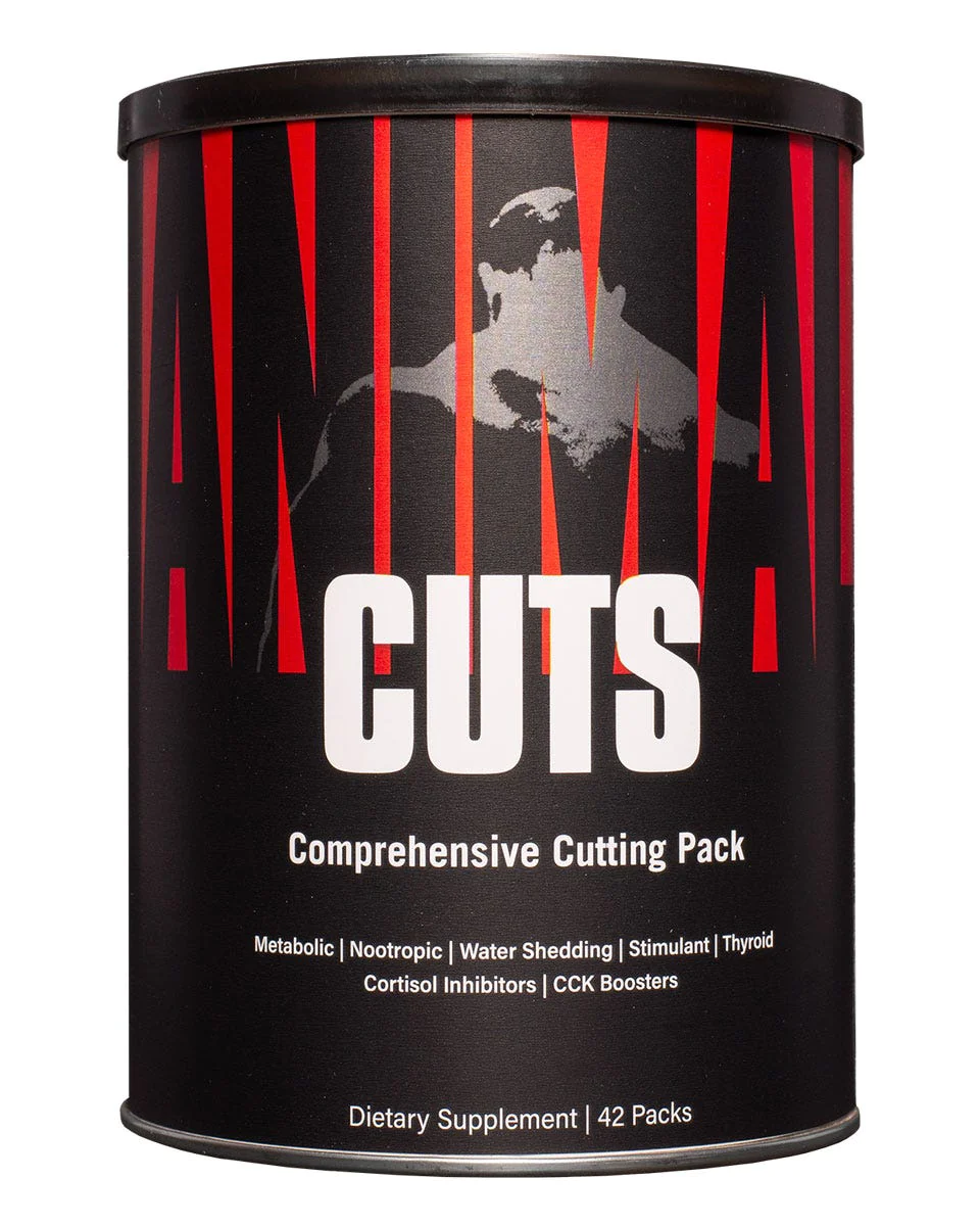 Animal Cuts targets many aspects of the cutting process. It includes eight complexes: (1) thermogenic complex; (2) metabolic complex; (3) thyroid complex; (4) diuretic complex; (5) nootropic complex; (6) cortisol-inhibiting complex; (7) appetite suppression complex; and (8) our special bioavailability complex.