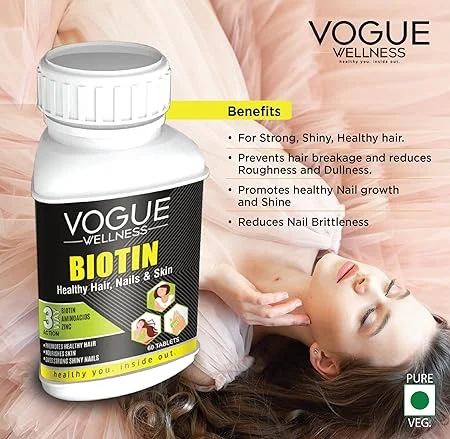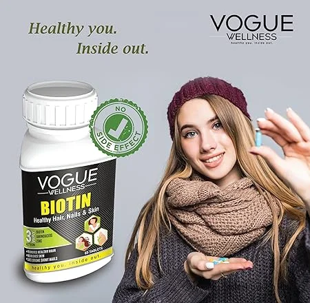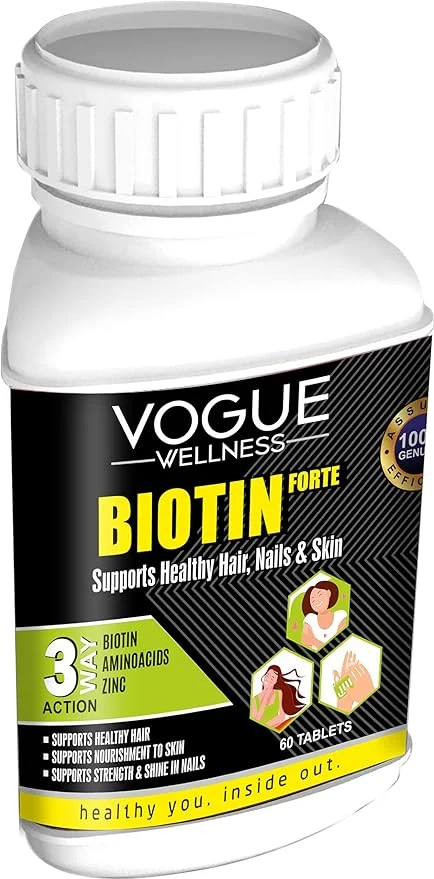 VOGUE Biotin+ 60 Capsules is a premium hair, skin, and nail support supplement enriched with high-potency biotin and essential nutrients. It helps promote stronger, shinier hair, radiant skin, and healthy nails while supporting your body’s natural collagen production and energy metabolism.