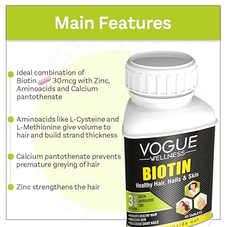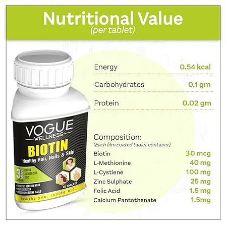 High-strength biotin formula for visible results. Supports hair, skin, and nail health naturally. 100% vegetarian and safe for daily use. Enriched with essential vitamins for overall nourishment.