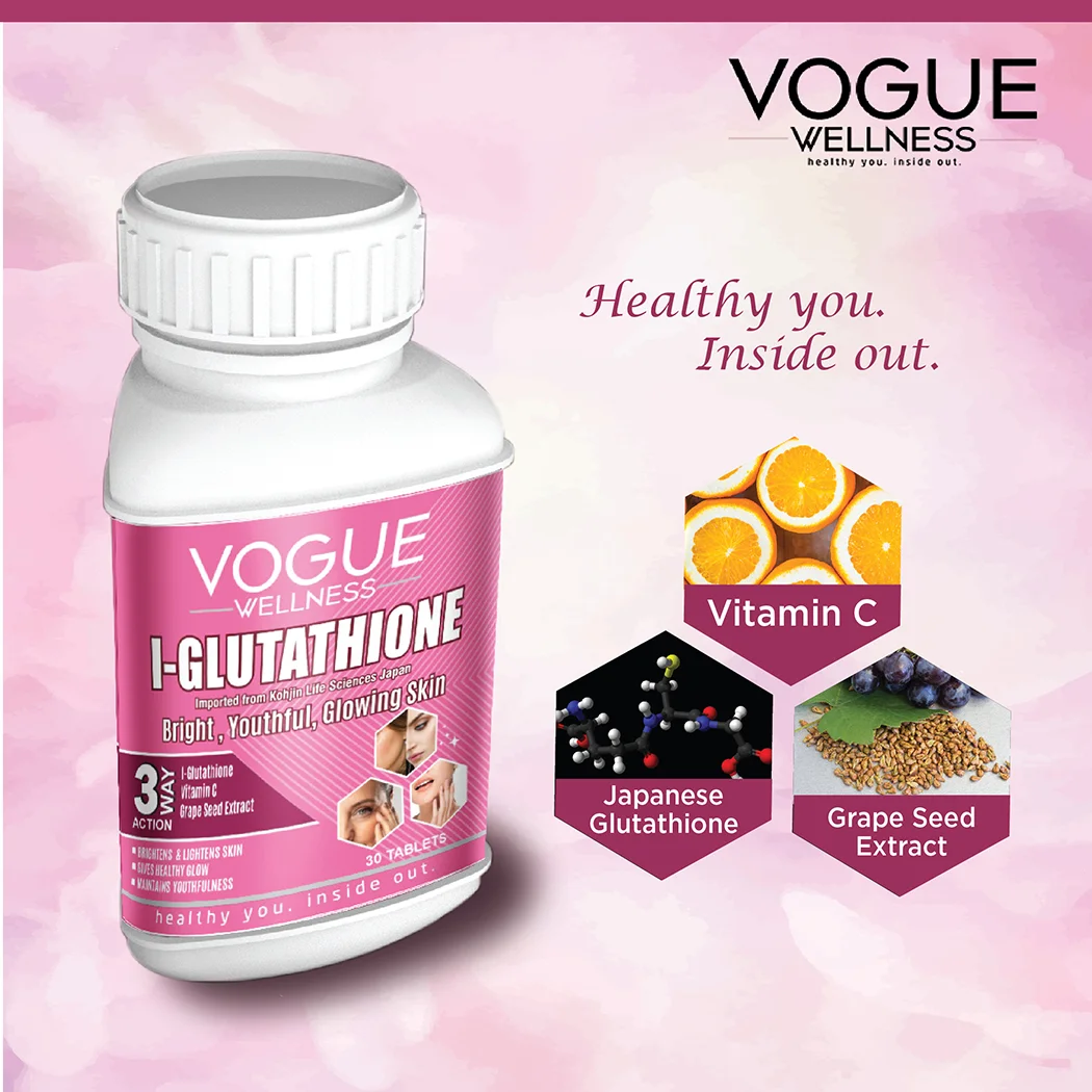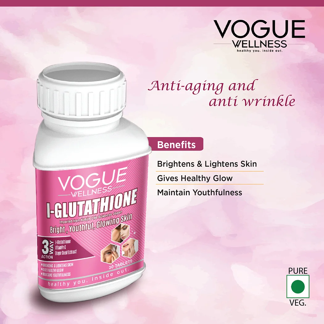VOGUE Glutathione 500mg 30 Tablets is a premium skin and antioxidant supplement crafted to promote radiant, youthful, and healthy-looking skin. Each tablet delivers high-strength glutathione — a powerful antioxidant that helps detoxify the body, reduce pigmentation, and protect cells from oxidative stress for a natural glow.