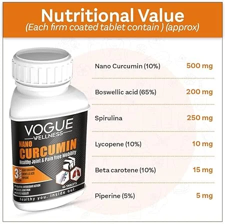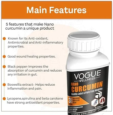 Vogue Nano Curcumin is a high-absorption curcumin supplement designed to support joint, heart, and overall wellness. Using nano-technology, it enhances bioavailability for faster and more effective antioxidant and anti-inflammatory benefits, promoting a healthier and active lifestyle.