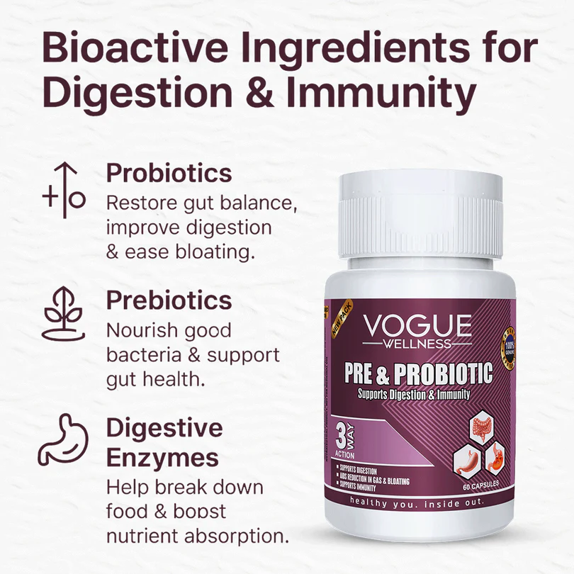 Vogue Wellness Pre & Probiotic Capsules may help improve digestion and immunity. These tablets also improve nutrient absorption.