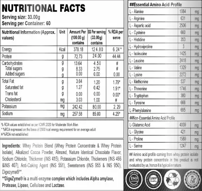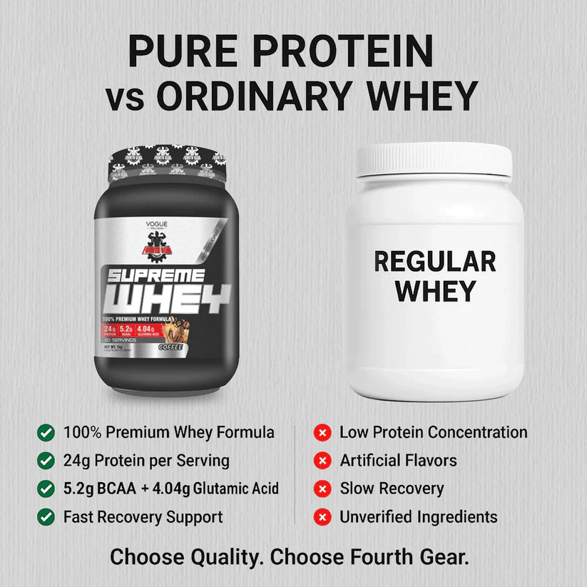 Vogue Wellness Present Fourth Gear SUPREME WHEY PROTEIN POWDER 100% Premium Whey Formula, PROTEIN 24G, BCAAs 5.2G, GLUTAMIC ACID 4.04G, Instructions for use :- To prepare one serving, add one scoop approx 33.00 g powder in a shaker and add 180-200 ml water. Shake well before drinking. DigeZyme is a multi-enzyme complex which includes Alpha amylase, Protease, Lipase, Cellulase and Lactase.