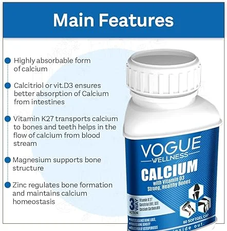 Vogue Wellness Calcium with Vitamin D3 & K2-7 Soft Gel Capsules is a scientifically formulated supplement that promotes strong bones, healthy joints, and better calcium absorption. Enriched with Vitamin D3 for improved calcium utilization and Vitamin K2-7 for bone mineralization, it helps maintain bone density and overall skeletal strength.