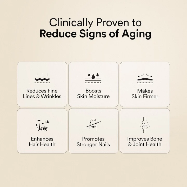 Introducing the World’s finest Hydrolyzed Type I & III Korean Marine Collagen Peptides, sustainably sourced from deep-sea Salmon. Backed by 20+ Clinical Studies, it visibly improves skin texture, elasticity, and hydration and diminishes wrinkles & fine lines. Made with flexibility in mind, our truly flavourless marine collagen powder seamlessly blends into any beverage, leaving your hair, skin, nails, joints, and gut glowing.